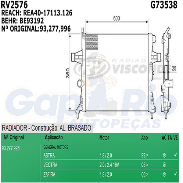 Radiador GM Astra Zafira 1.8/2.0 de 1999 adiante