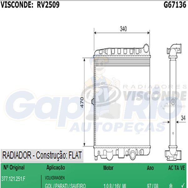 Radiador VW Gol Parati Saveiro 1.0 8v/16v MI 1997/2008 c/ ar